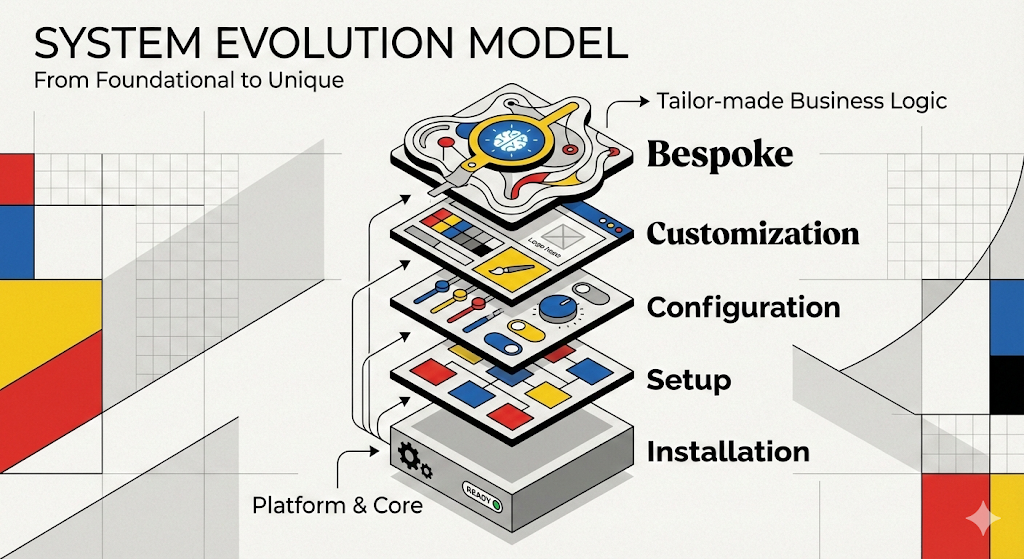 | 5 | Bespoke | Engineered from Scratch. Developing unique, made-to-order code solutions to solve problems that cannot be addressed by standard or customized software. | Writing a unique Plugin for a proprietary business process or building a completely original theme architecture from zero. |